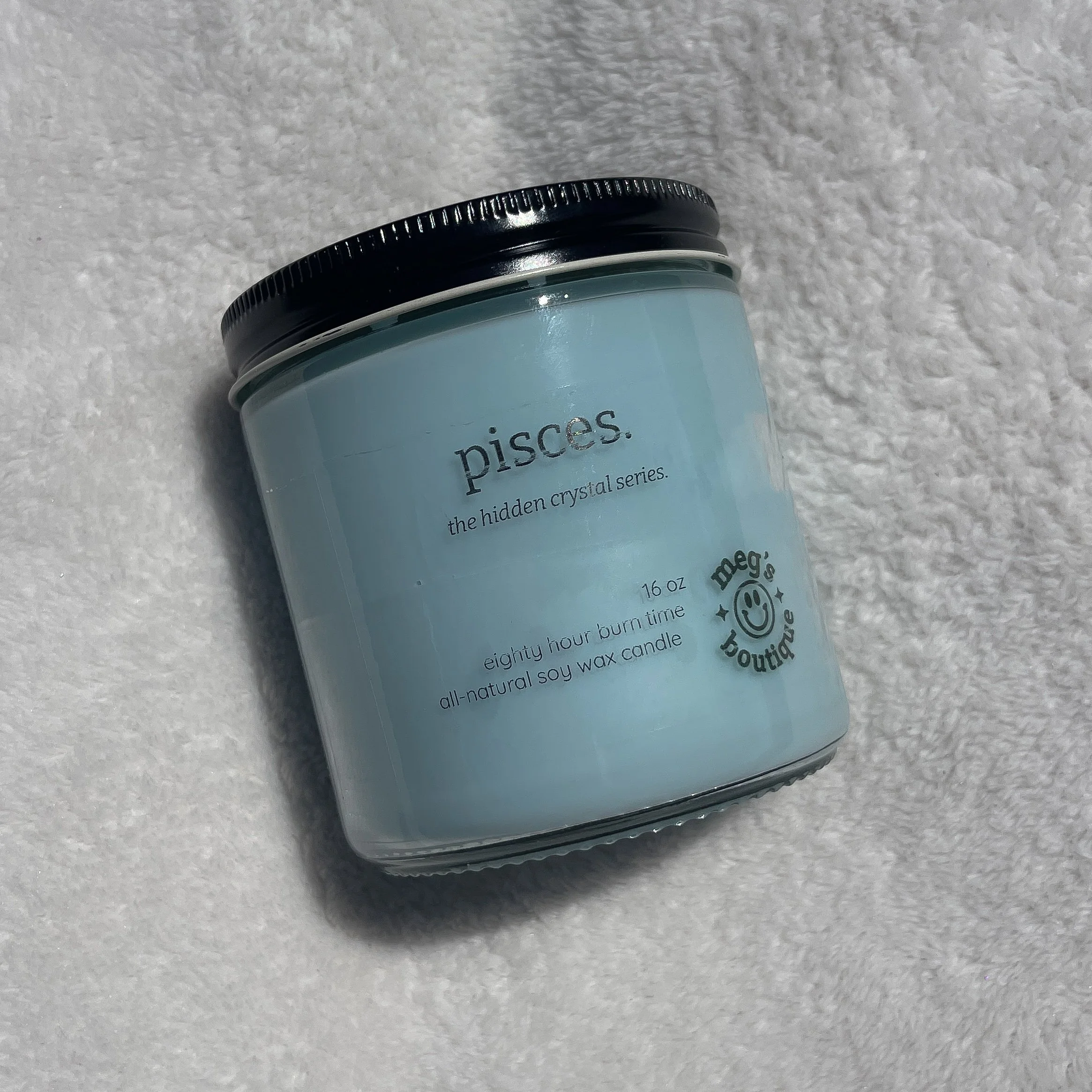 february 19 - march 20. designed for kind & giving pisces placements, this candle is scented with a soft oceanic fragrance intended to ground them and allow for an escape. hidden inside is the amethyst, providing the pisces with courage and strength. coloured in a pastel blue shade & topped with various glitter decorations.
